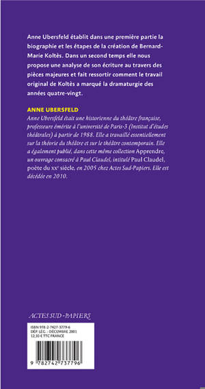 Anne Ubersfeld établit, dans une première partie, la biographie et les étapes de la création de Bernard-Marie Koltès. Dans un second temps, elle nous propose une analyse de son écriture au travers des pièces majeurs et fait ressortir comment le travail original de Koltès a marqué la dramaturgie des années quatre-vingt.