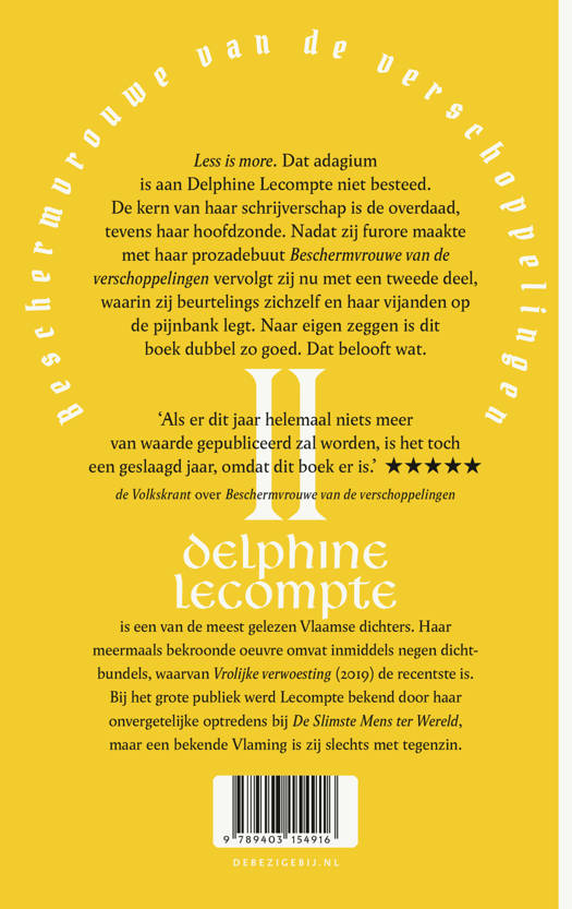 Less is more. Dat adagium is aan Delphine Lecompte niet besteed. De kern van haar schrijverschap is de overdaad – tevens haar hoofdzonde. Waar die bij anderen schaadt, is ze voor de schrijver-dichteres bij uitstek het middel om de wereld te bedwingen. Begin dit jaar verblufte Lecompte iedereen met Beschermvrouwe van de verschoppelingen, haar veelbesproken, nietsontziende prozadebuut. Daarin legde ze beurtelings zichzelf, haar dierbaren en haar vijanden op de pijnbank en hield ze feilloos de grootste moraalridders een spiegel voor die toonde dat hun luide geroep diep wortelt in hypocrisie. Nu komt ze met de opvolger, deel II, waarin de waanzin andermaal welig tiert en dat naar eigen zeggen dubbel zo goed is. Dat belooft wat.