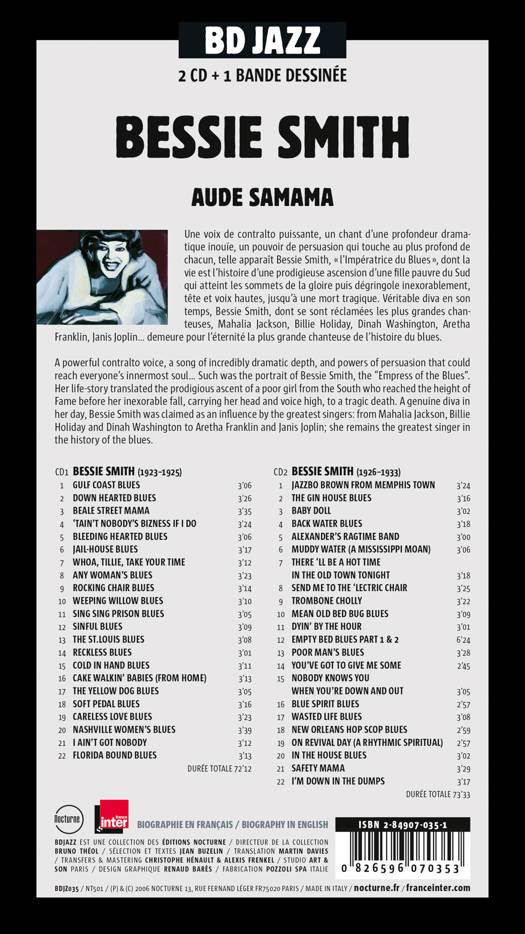 Bessie Smith chanteuse<br /> Une voix de contralto puissante, un chant d’une<br /> profondeur dramatique inouïe, un pouvoir de<br /> persuasion qui touche au plus profond de<br /> chacun, telle apparaît Bessie Smith,<br /> “l’Impératrice du Blues“, dont la vie est l’histoire<br /> d’une prodigieuse ascension d’une fille pauvre<br /> du Sud qui atteint les sommets de la gloire puis<br /> dégringole inexorablement, tête et voix hautes,<br /> jusqu’à une mort tragique. Véritable diva en son<br /> temps, Bessie Smith, dont se sont réclamées les<br /> plus grandes chanteuses, Mahalia Jackson,<br /> Billie Holiday, Dinah Washington, Aretha<br /> Franklin, Janis Joplin... demeure pour l’éternité<br /> la plus grande chanteuse de l’histoire du blues.<br />