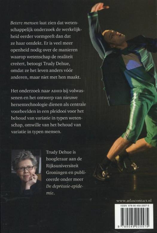 Betere mensen laat zien dat wetenschappelijk onderzoek de werkelijkheid eerder vormgeeft dan dat ze haar ontdekt. Er is veel meer openheid nodig over de manieren waarop wetenschap de realiteit creëert, betoogt Trudy Dehue, omdat ze het leven anders vóór anderen, maar niet met hen maakt. Het onderzoek naar ADHD bij volwassenen en het ontwerp van nieuwe hersentechnologie dienen als centrale voorbeelden in een pleidooi voor het behoud van variatie in typen wetenschap, omwille van het behoud van variatie in typen mensen