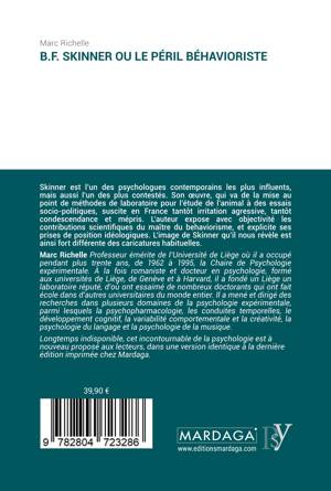 Skinner est l'un des psychologues contemporains les plus influents, mais aussi l'un des plus contestés. Son oeuvre, qui va de la mise au point de méthodes de laboratoire pour l'étude de l'animal à des essais socio-politiques, suscite en France tantôt irritation agressive, tantôt condescendance et mépris. L'auteur expose avec objectivité les contributions scientifiques du maître du behaviorisme, et explicite ses prises de position idéologiques. L'image de Skinner qu'il nous révèle est ainsi fort différente des caricatures habituelles. Marc Richelle Professeur émérite de l'Université de Liège où il a occupé pendant plus trente ans, de 1962 à 1995, la Chaire de Psychologie expérimentale. À la fois romaniste et docteur en psychologie, formé aux universités de Liège, de Genève et à Harvard, il a fondé un Liège un laboratoire réputé, d'où ont essaimé de nombreux doctorants qui ont fait école dans d'autres universitaires du monde entier. Il a mené et dirigé des recherches dans plusieurs domaines de la psychologie expérimentale, parmi lesquels la psychopharmacologie, les conduites temporelles, le développement cognitif, la variabilité comportementale et la créativité, la psychologie du langage et la psychologie de la musique.