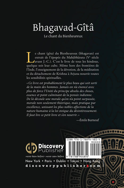 Ce chant (gîta) du Bienheureux (bhagavan) est extrait de l'épopée du Mahâbhârata (Ve siècle avant J.-C.). C'est le livre de tous les hindous, quelque soit leur culte. Même hors des frontières de l'Inde, l'enseignement de la dévotion, de la méditation et du détachement de Krishna à Arjuna nourrit toutes les sensibilités spirituelles.