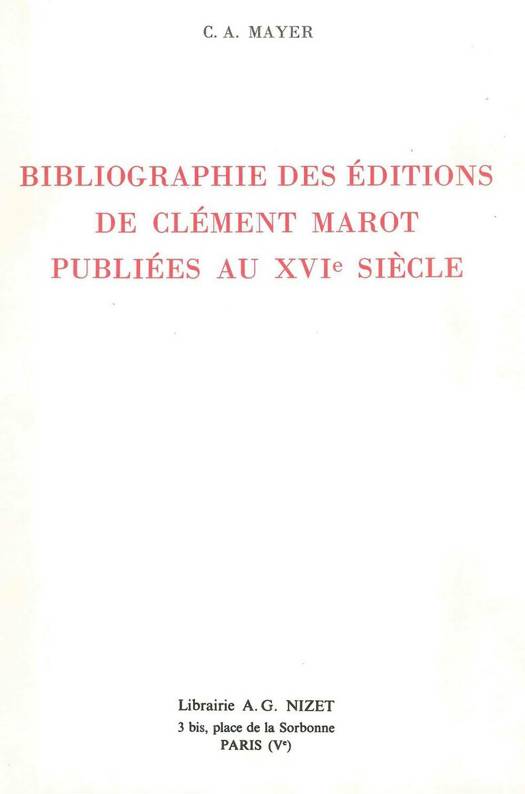Cet ouvrage constitue la reimpression, mise a jour, du tome II ("Editions") de la Bibliographie des oeuvres de Clement Marot par Claude-Albert Mayer, publiee a Geneve en 1954, et qui fut assez vite epuisee. Des son vivant, les textes de Clement Marot (1496-1544) furent edites de facon compilatoire. Il etait donc necessaire de presenter ses ecrits dans leur edition princeps, en eux-memes, degages de toute compilation. C'est a ce travail d'orfevre que Claude-Albert Mayer a consacre une grande partie de ses recherches sur le poete et sur la Renaissance francaise en matiere de litterature. Cette bibliographie forme le complement indispensable du Tableau chronologique des publications de Marot, donne par Pierre Villey en 1921. Chaque edition d'un texte est minutieusement decrite par Mayer, qui a eu en outre l'excellente idee de presenter de nombreux fac-similes des bois graves des pages de titre, des frontispices ou d'illustrations contenues dans ces anciens, delicats et precieux ouvrages.