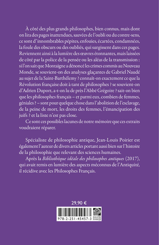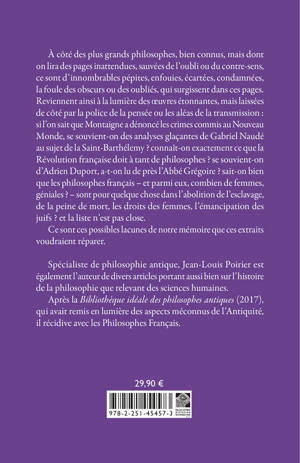 A cote des plus grands philosophes, bien connus, mais dont on lira des pages inattendues, sauvees de l'oubli ou du contre-sens, ce sont d'innombrables pepites, enfouies, ecartees, condamnees, la foule des obscurs ou des oublies, qui surgissent dans ces pages. Reviennent ainsi a la lumiere des oeuvres etonnantes, mais laissees de cote par la police de la pensee ou les aleas de la transmission: si l'on sait que Montaigne a denonce les crimes commis au Nouveau Monde, se souvient-on des analyses glacantes de Gabriel Naude au sujet de la Saint-Barthelemy ? Connait-on exactement ce que la Revolution francaise doit a tant de philosophes ? Se souvient-on d'Adrien Duport, a-t-on lu de pres l'Abbe Gregoire ? Sait-on bien que les philosophes francais - et parmi eux, combien de femmes, geniales ? - sont pour quelque chose dans l'abolition de l'esclavage, de la peine de mort, les droits des femmes, l'emancipation des juifs ? Et la liste n'est pas close. Ce sont ces possibles lacunes de notre memoire que ces extraits voudraient reparer.