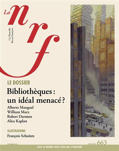 Éditorial : Olivia Gesbert, Lisez le monde avec ceux qui l'écrivent ! Patrick Weil, Lisez le monde avec Bibliothèques sans Frontières ! Les voix de l'architecture : Dominique Perrault, Les fictions de l'architecte (entretien) Bibliothèques : un idéal menacé ? : Alberto Manguel, La bibliothèque comme micro- et macrocosme William Marx, Le mystère Ovide : une affaire de bibliothèques Julien Brocard, La bibliothèque des livres qui n'ont jamais été écrits Vanessa de Senarclens, Les bibliothèques et les "pertes de guerre" Cyrille Martinez, Manger la bibliothèque Robert Darnton, La censure des livres et le trumpisme Alice Kaplan, Mark Twain à contre-courant. Des Aventures de Huckleberry Finn à James de Percival Everett Isabelle Jarry, On a banni les démons et les fées. À propos de 1984 de George Orwell Cahier critique : spécial littérature étrangère : Blandine Rinkel, L'appel de Leila Guerriero (Rivages) Julien Delmaire, Les griffes de la forêt de Gabriela Cabezón Cámara (Grasset) Clément Bénech, Cet autre Éden de Paul Harding (Buchet-Chastel) Amina Damerdji, Les fleuves du ciel d'Elif Shafak (Flammarion) Vincent Message, Le garçon venu de la mer de Garrett Carr (Gallmeister) Fabrice Humbert, Jeux de lumière de Daniel Kehlmann (Actes Sud) Olivier Barrot, Kairos de Jenny Erpenbeck (Gallimard) Anne Serre, Je ne te verrai pas mourir d'Antonio Muñoz Molina (Seuil) Grégory Le Floch, Fox de Joyce Carol Oates (Philippe Rey) Benjamin Hoffmann, 16 parties de chasse de Tehila Hakimi (Denoël) Nicolas Le Flahec, Les bons voisins de Nina Allan (Tristram) Blandine Rinkel, Pathemata ou L'histoire de ma bouche de Maggie Nelson (Éd. du sous-sol) Feya Dervitsiotis, Vibrato de Teju Cole (Zoé) Véronique Ovaldé, Les vulnérables de Sigrid Nunez (Stock) Ouvertures : Trois tragédies d'aujourd'hui : David Lescot, Les Perses d'Eschyle. Le théâtre à l'origine Olivier Barrot, Hécube, pas Hécube. Quand Tiago Rodrigues feat. Euripide... Blandine Masson, Tous des oiseaux. Dans les yeux de Wajdi Mouawad