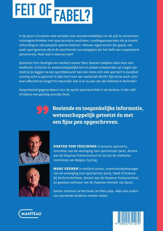 In de sport circuleren veel verhalen over wondermiddeltjes om de pijn te verzachten, trainingstechnieken met spectaculaire resultaten, voedingspreparaten die je kracht, uithouding en ultrasoepele spieren beloven. Nieuwe rages komen (en gaan), net zoals sportgoeroes die je de sporthemel voorspiegelen (en het liefst een supplement aansmeren). Maar wat is daarvan aan? Sportarts Tom Teulingkx en medisch auteur Marc Geenen bekijken alles door een medische, kritische en wetenschappelijke bril en zoeken antwoorden op vragen als: moet je ijs leggen na een sportblessure? Kan een mens zich ziek sporten? Is barefoot running echt zo gezond? Is seks kort voor een wedstrijd slecht? Zijn korte work-outs even effectief als lange? En natuurlijk: wat is er nu aan van die biefstuk in de broek? Gespreksstof gegarandeerd voor de après-sportactiviteit in de kantine, in het café of tijdens een gezellig avondje thuis.