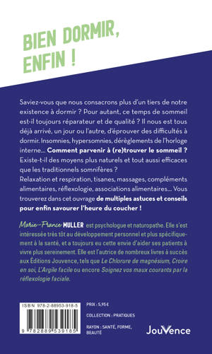 Saviez-vous que nous consacrons plus d’un tiers de notre existence à dormir ? Pour autant, ce temps de sommeil est-il toujours réparateur et de qualité ? Il nous est tous déjà arrivé, un jour ou l’autre, d’éprouver des difficultés à dormir. Insomnies, hypersomnies, dérèglements de l’horloge interne… Comment parvenir à (re)trouver le sommeil ? Existe-t-il des moyens plus naturels et tout aussi efficaces que les traditionnels somnifères ? Relaxation et respiration, tisanes, massages, compléments alimentaires, réflexologie, associations alimentaires… Vous trouverez dans cet ouvrage de multiples astuces et conseils pour enfin savourer l’heure du coucher !