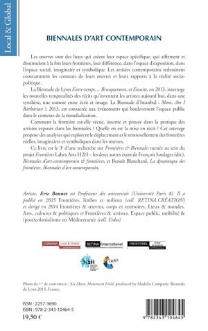 La biennale de Lyon Entre-temps... Brusquement, et Ensuite, en 2013, interroge les nouvelles temporalités des récits qu'inventent les artistes aujourd'hui, dans une synthèse, une osmose entre écrit et image. La biennale d'Istanbul : Mom, Am I barbarian ?, 2013 est consacrée aux événements qui bouleversent l'espace public dans le contexte de la mondialisation. Comment la frontière est-elle vécue, inscrite et pensée dans la pratique des artistes exposés dans les biennales ? Cet ouvrage propose des analyses qui explorent le déplacement et le renouvellement des frontières réelles, imaginaires et symboliques dans les oeuvres.