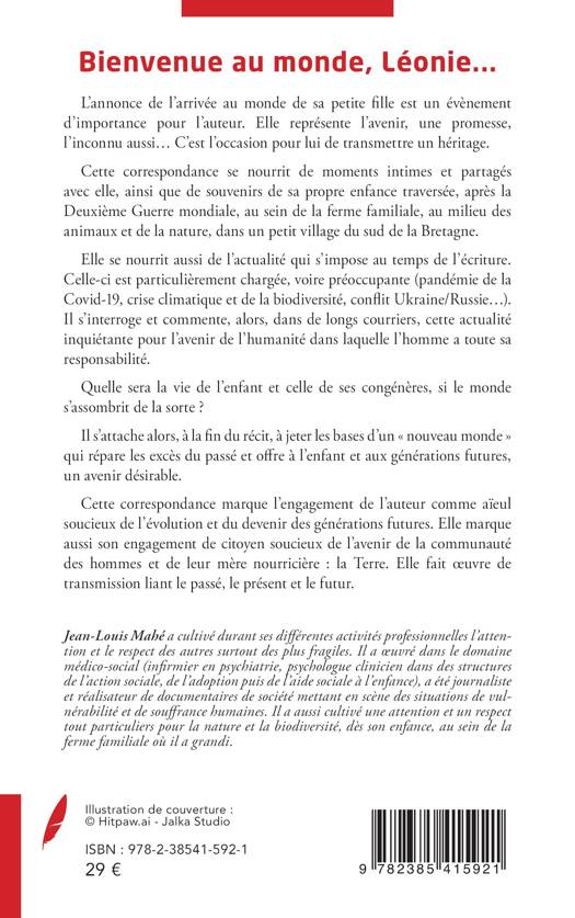 L’annonce de l’arrivée au monde de sa petite fille est un évènement d’importance pour l’auteur. Elle représente l’avenir, une promesse, l’inconnu aussi… C’est l’occasion pour lui de transmettre un héritage. Cette correspondance se nourrit de moments intimes et partagés avec elle, ainsi que de souvenirs de sa propre enfance traversée, après la Deuxième Guerre mondiale, au sein de la ferme familiale, au milieu des animaux et de la nature, dans un petit village du sud de la Bretagne. Elle se nourrit aussi de l’actualité qui s’impose au temps de l’écriture. Celle-ci est particulièrement chargée, voire préoccupante (pandémie de la Covid-19, crise climatique et de la biodiversité, conflit Ukraine/Russie…). Il s’interroge et commente, alors, dans de longs courriers, cette actualité inquiétante pour l’avenir de l’humanité dans laquelle l’homme a toute sa responsabilité. Quelle sera la vie de l’enfant et celle de ses congénères, si le monde s’assombrit de la sorte ? Il s’attache alors, à la fin du récit, à jeter les bases d’un « nouveau monde » qui répare les excès du passé et offre à l’enfant et aux générations futures, un avenir désirable. Cette correspondance marque l’engagement de l’auteur comme aïeul soucieux de l’évolution et du devenir des générations futures. Elle marque aussi son engagement de citoyen soucieux de l’avenir de la communauté des hommes et de leur mère nourricière : la Terre. Elle fait œuvre de transmission liant le passé, le présent et le futur.