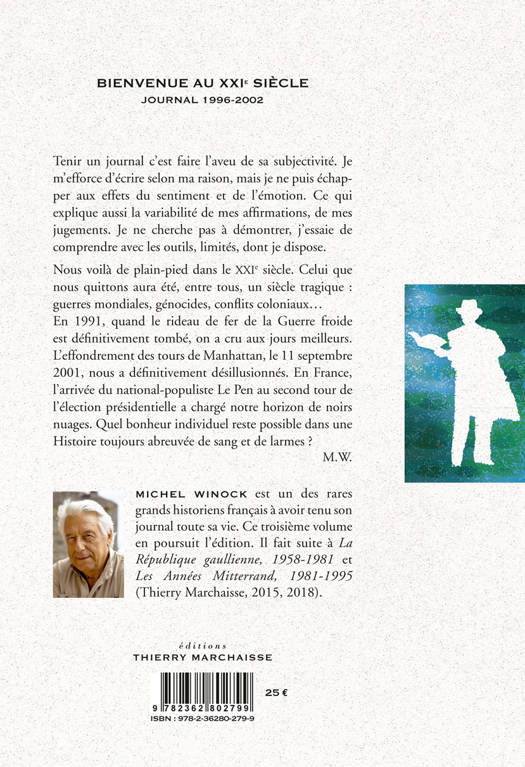 « Tenir un journal c’est faire l’aveu de sa subjectivité. Je m’efforce d’écrire selon ma raison, mais je ne puis échapper aux effets du sentiment et de l’émotion. Ce qui explique aussi la variabilité de mes affirmations, de mes jugements. Je ne cherche pas à démontrer, j’essaie de comprendre avec les outils, limités, dont je dispose. Nous voilà de plain-pied dans le XXIe siècle. Celui que nous quittons aura été, entre tous, un siècle tragique : guerres mondiales, génocides, conflits coloniaux... En 1991, quand le rideau de fer de la Guerre froide est définitivement tombé, on a cru aux jours meilleurs. L’effondrement des tours de Manhattan, le 11 septembre 2001, nous a définitivement désillusionnés. En France, l’arrivée du national-populiste Le Pen au second tour de l’élection présidentielle a chargé notre horizon de noirs nuages. Quel bonheur individuel reste possible dans une Histoire toujours abreuvée de sang et de larmes ? » M.W. Michel WINOCK est l’un des rares grands historiens français à avoir tenu son journal toute sa vie. Ce troisième volume en poursuit l’édition. Il fait suite à La République gaullienne, 1958-1981 et Les années Mitterrand 1981-1995 (Thierry Marchaisse, 2015, 2018).