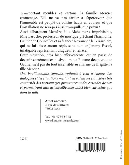Transportant meubles et cartons, la famille Mercier emménage. Elle ne va pas tarder à s'apercevoir que l'immeuble est peuplé de voisins hauts en couleur et que l'installation ne sera pas aussi tranquille que prévu ! Ainsi débarquent Mémère, à l'« Alzheimer » imprévisible, Mlle Laroche, professeur de musique prêchant l'harmonie, Gautier de Courcelles et sa fi ancée Roxane de la Buzardière, qui ne lui laisse aucun répit, sans oublier Jeremy Fassol, infatigable représentant dragueur et tenace. Cette situation, déjà bien effervescente, est en passe de devenir carrément explosive lorsque Roxane découvre que Gautier n'est pas du tout insensible au charme de Brigitte, la fille Mercier... Une bouillonnante comédie, rythmée à cent à l'heure. Les dialogues et les situations mettant en valeur les caractères très contrastés des personnages provoqueront des cascades de rire et permettront aux acteursd'évoluer aussi bien sur scène que dans la salle.