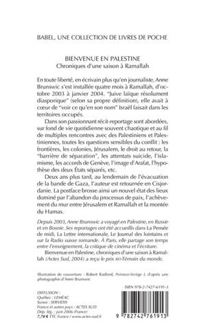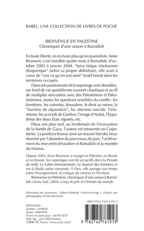 En toute liberté, en écrivain plus qu'en journaliste, Anne Brunswic s'est installée quatre mois à Ramallah, d'octobre 2003 à janvier 2004. "Juive laïque résolument diasporique" (selon sa propre définition), elle avait à coeur de "voir ce qu'en son nom" Israël faisait dans les territoires occupés. Dans son passionnant récit-reportage sont abordées, sur fond de vie quotidienne souvent chaotique et au fil de multiples rencontres avec des Palestiniens, notamment de nombreuses femmes engagées, toutes les questions sensibles du conflit : les frontières, les colonies, Jérusalem, le droit au retour, la "barrière de séparation", les attentats-suicides, l'islamisme, les accords de Genève, l'image d'Arafat, l'hypothèse des deux Etats séparés, etc. Deux ans plus tard, au lendemain de l'évacuation de la bande de Gaza, elle est retournée en Cisjordanie. Dans une postface inédite, elle brosse un nouvel état des lieux dominé par l'abandon du processus de paix, l'achèvement du mur entre Jérusalem et Ramallah et la montée du Hamas.