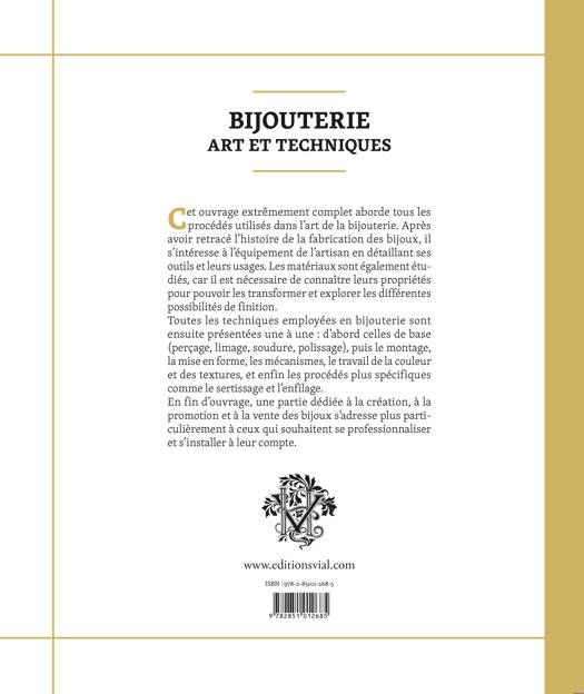 Cet ouvrage extrêmement complet aborde tous les procédés utilisés dans l’art de la bijouterie. Après avoir retracé l’histoire de la fabrication des bijoux, il s’intéresse à l’équipement de l’artisan en détaillant ses outils et leurs usages. Les matériaux sont également étudiés, car il est nécessaire de connaître leurs propriétés pour pouvoir les transformer et explorer les différentes possibilités de finition.
