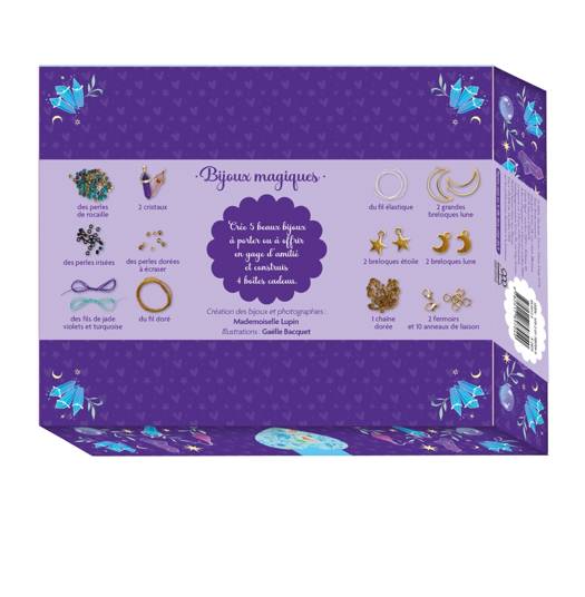 Crée 5 beaux bijoux a perler ou à offrir en gage d'amitié et construis 4 boîtes cadeau. Matériel : des perles de rocaille, 2 cristaux, des perles irisées, des perles dorées à écraser, des fils de jade violets et turquoise, du fil doré, du fil élastique, 2 grandes breloques lune, 2 breloques étoile, 2 breloques lune, 1 chaîne dorée, 2 fermoirs et 10 anneaux de liaison.