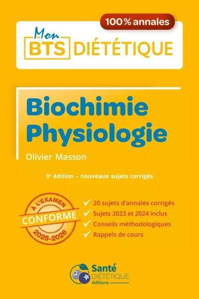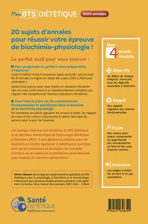 20 années d’annales pour réussir votre épreuve de biochimie-physiologie !Le parfait outil pour vous exercer :• Pour progresser et parfaire votre préparation à l’épreuveCette 3e édition possède 9 nouveaux sujets exclusifs, soit un total de 20 annales corrigées en détail des sujets 2005 à 2024 pour s’entraîner !Autant d’occasion pour vous mettre en situation d’examen réel, en vous confrontant à un questionnement complexe qui requiert des compétences relatives à plusieurs disciplines.• Pour faire le point sur les connaissances fondamentales et spécifiques dans le domaine de la biochimie-physiologieDe nombreux encadrés signalent les erreurs à éviter, les rappels de cours et les notions importantes à retenir ainsi que les astuces pour le jour de l’examen.CiblesCet ouvrage s’adresse aux étudiants du BTS Diététique et du Bachelor Universitaire de Technologie (BUT). Il sera également précieux pour les étudiants en DU/DIU appliqués à diététique et nutrition, ainsi qu’aux personnes en formation de Conseiller nutrition, ou en médecine et formations paramédicales avec modules en nutrition-alimentationL'auteurOlivier Masson est enseignant expérimenté et spécialiste du BTS Diététique pour la physiologie, la biochimie et la microbiologie. Intervenant dans plusieurs établissements parisiens, il est également correcteur de la maison des examens (SIEC) Paris-Créteil.