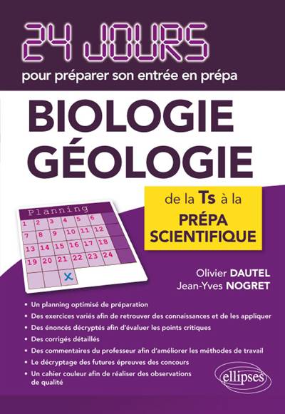 Ces 24 séances, programmées dans un ordre bien réfléchi et de difficultés croissantes vont vous permettre de vous glisser progressivement dans la peau d’un étudiant de classe préparatoire. Utiliser cet ouvrage tout au long de l’année puis de façon plus intense durant l’été est donc l’assurance de réussir son entrée en classe préparatoire BCPST.