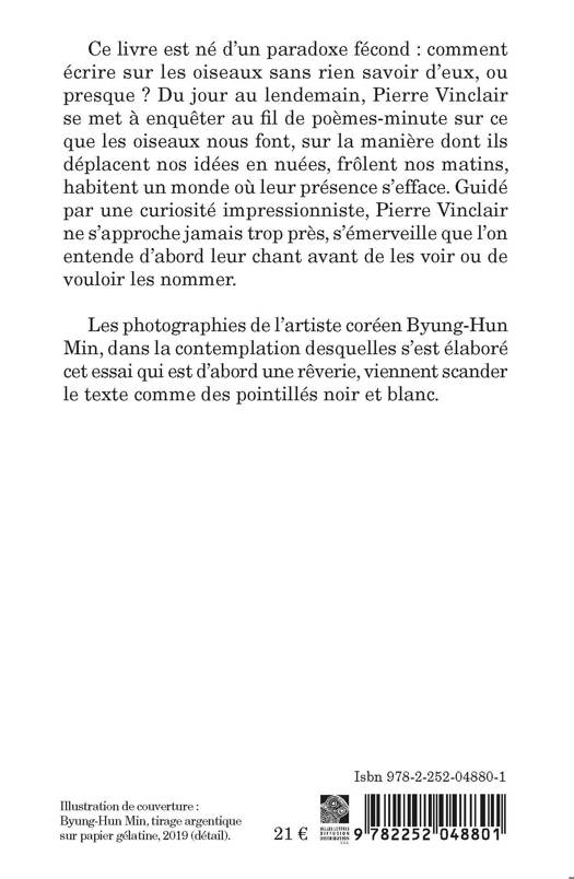 Ce livre est né d’un paradoxe fécond : comment écrire sur les oiseaux sans rien savoir d’eux, ou presque ? Du jour au lendemain, Pierre Vinclair se met à enquêter au fil de poèmes-minute sur ce que les oiseaux nous font, sur la manière dont ils déplacent nos idées en nuées, frôlent nos matins, habitent un monde où leur présence s’efface. Guidé par une curiosité impressionniste, Pierre Vinclair ne s’approche jamais trop près, s’émerveille que l’on entende d’abord leur chant avant de les voir ou de vouloir les nommer.