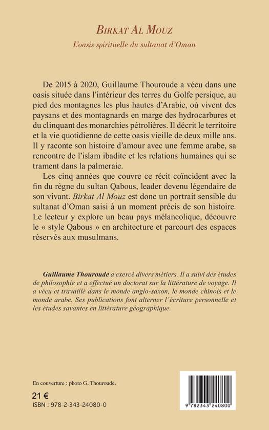 De 2015 à 2020, Guillaume Thouroude a vécu dans une oasis située dans l’intérieur des terres du Golfe persique, au pied des montagnes les plus hautes d’Arabie, où vivent des paysans et des montagnards en marge des hydrocarbures et du clinquant des monarchies pétrolières. Il décrit le territoire et la vie quotidienne de cette oasis vieille de deux mille ans. Il y raconte son histoire d’amour avec une femme arabe, sa rencontre de l’islam ibadite et les relations humaines qui se trament dans la palmeraie. Les cinq années que couvre ce récit coïncident avec la fin du règne du sultan Qabous, leader devenu légendaire de son vivant. Birkat Al Mouz est donc un portrait sensible du sultanat d’Oman saisi à un moment précis de son histoire.