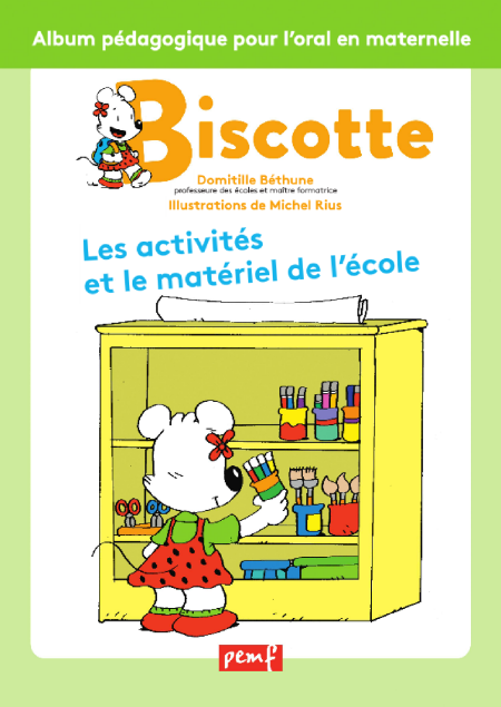 Les livres de Biscotte ont comme objectif de travailler la construction de phrases à l’oral, ainsi que le développement du vocabulaire. Ils s’adressent principalement à tous les jeunes élèves qui commencent à parler : les classes de TPS, de PS et de MS en milieu ordinaire et surtout dans toutes les classes de maternelle en REP+, où la demande pour ce genre de livres est très attendue par les enseignants (ainsi que pour les élèves allophones de GS ou les élèves avec des difficultés de langage, et éventuellement en crèches). Les activités et le matériel de l’école PS / MS : Biscotte, les activités et le matériel de l’école propose de développer le lexique sur ce thème. L’objectif syntaxique visé sera le développement de la phrase simple, ainsi que la phrase infinitive répétitive : « elle aime + infinitif ». Ce livre mettra en mots l’ensemble des activités de l’école avec des verbes fréquemment employés en classe, ainsi que le matériel de l’école à mémoriser.