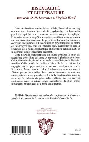 Ce livre tente de répondre à plusieurs questions. Celle, bien entendu, du rôle exact de la bisexualité dans le dispositif freudien. Celle, aussi, de l'efficacité réelle de la reconsidération engagée par la psychanalyse et de ses conséquences sur la littérature. Mais, surtout, plus fondamentalement encore, il s'interroge sur la manière dont pourra désormais se dire une androgynie qui n'est plus de l'ordre de la représentation mais de celui de la pulsion et, pour cela, s'attarde sur les oeuvres, contrastées mais en même temps exemplaires, de deux grands romanciers britanniques de l'entre-deux guerres.