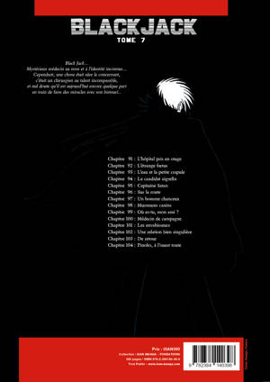 Black Jack, chirurgien sans diplôme qui opère dans la clandestinité et qui demande des sommes astronomiques pour ses interventions, est un personnage ténébreux et hors-la-loi. Il passe sa vie à sauver celle des autres. En revanche, la société médicale refuse de l'admettre comme médecin. Ils nient même son existence. Black Jack pratique tranquillement dans sa petite clinique avec son assistante Pinoko, qu'il a volontairement sauvé auparavant. Des patients, diagnostiqués avec des maladies rares, lui rendent visite avec espoir d'être enfin soignés, quelques soient les circonstances morales. Cette édition de luxe sort à l'occasion du 50eme anniversaire de la série (1973-2023).
