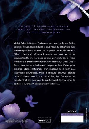 Violet Baker fait rêver Paris avec son spectacle aux Folies Bergère. Influenceuse adulée le jour, reine du cabaret la nuit, elle navigue dans un monde de paillettes et de secrets.Ethann Legrand, séduisant journaliste, veut écrire sa biographie. Du moins, c'est ce qu'il prétend... Car derrière le charme d'Ethann se cache Onyx, un espion de la DGSE. En apparence, sa mission est simple : utiliser Violet pour s'infiltrer dans l'entourage d'un magnat de la tech aux intentions douteuses. Mais à mesure qu'Onyx plonge dans l'univers envoûtant de Violet, les frontières se brouillent et les sentiments qu'il croyait feindre pour la séduire deviennent dangereusement réels...
