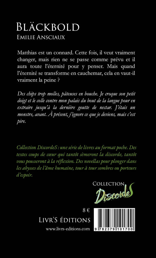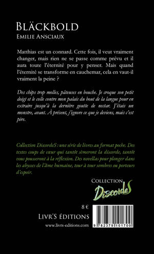 "Matthias est un connard. En 2020, il veut changer. Il aura toute l’éternité pour essayer. Mais quand l’éternité se transforme en cauchemar, faut-il vraiment se donner la peine ? « Des chips trop molles, pâteuses en bouche. Je croque son petit doigt et le colle contre mon palais du bout de la langue pour en extraire jusqu’à la dernière goutte de nectar. J’étais un monstre, avant. À présent, j’ignore ce que je deviens, mais c’est pire. »