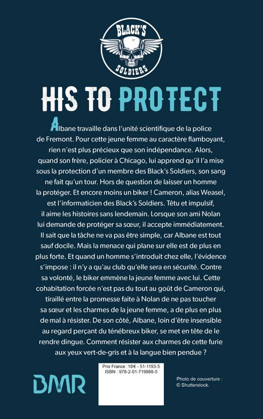 Albane travaille dans l’unité scientifique de la police de Fremont. Pour cette jeune femme au caractère flamboyant, rien n’est plus précieux que son indépendance. Alors, quand son frère, policier à Chicago, lui apprend qu’il l’a mise sous la protection d’un membre des Black’s Soldiers, son sang ne fait qu’un tour. Hors de question de laisser un homme la protéger. Et encore moins un biker ! Cameron, alias Weasel, est l’informaticien des Black’s Soldiers. Têtu et impulsif, il aime les histoires sans lendemain. Lorsque son ami Nolan lui demande de protéger sa sœur, il accepte immédiatement. Il sait que la tâche ne va pas être simple, car Albane est tout sauf docile. Mais la menace qui plane sur elle est de plus en plus forte. Et quand un homme s’introduit chez elle, l’évidence s’impose : il n’y a qu’au club qu’elle sera en sécurité. Contre sa volonté, le biker emmène la jeune femme avec lui. Cette cohabitation forcée n’est pas du tout au goût de Cameron qui, tiraillé entre la promesse faite à Nolan de ne pas toucher sa sœur et les charmes de la jeune femme, a de plus en plus de mal à résister. De son côté, Albane, loin d’être insensible au regard perçant du ténébreux biker, se met en tête de le rendre dingue. Comment résister aux charmes de cette furie aux yeux vert-de-gris et à la langue bien pendue ?