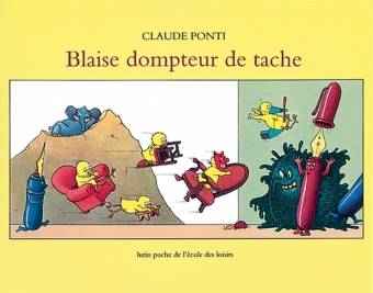 Blaise, le poussin masqué, est très fort. Aujourd'hui, il va dompter une tache, une grosse tache d'encre qui a un joli nom et un sale caractère. Blaise lève son fouet. Au bout du fouet, il y a la gomme à deux couleurs. Ça va faire un beau « pestacle ».