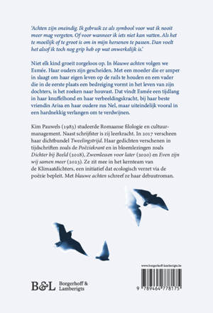 Niet elk kind groeit zorgeloos op. In blauwe achten volgen we Esmée. Haar ouders zijn gescheiden. Met een moeder die er amper in slaagt om haar eigen leven op de rails te houden en een vader die in de eerste plaats een bedreiging vormt in het leven van zijn dochters, is het zoeken naar houvast. Die vindt Esmée een tijdlang in haar knuffelbeer en haar verbeeldingskracht, bij haar beste vriendin Arisa en haar oudere zus Nel, maar uiteindelijk vooral in een hardnekkig verlangen om te verdwijnen.