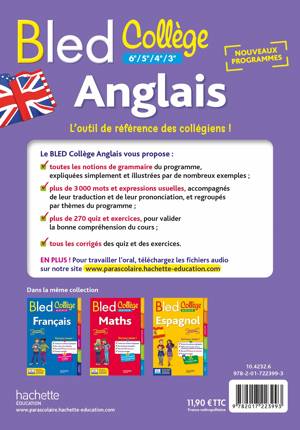 Le Bled Anglais collège s’adresse aux collégiens de la 6eà la 3e et à leurs parents. Il traite l’ensemble du programme d’anglais du collège pour correspondre aux paliers A1, A2, B1 du CECRL (B1 = niveau seuil du lycée / fin scolarité obligatoire).