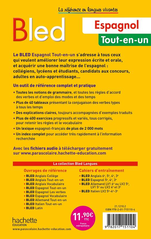 Le BLED Espagnol Tout-en-un s’adresse à tous ceux qui veulent améliorer leur expression écrite et orale, et acquérir une bonne maîtrise de l’espagnol : collégiens, lycéens et étudiants, candidats aux concours, adultes en auto-apprentissage…