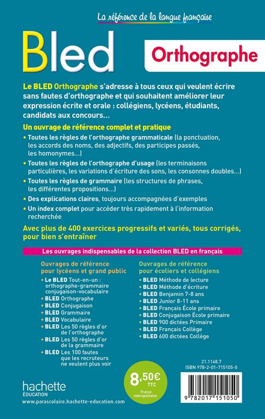 Le BLED Orthographe s’adresse à tous ceux qui veulent écrire sans fautes d’orthographe et qui souhaitent améliorer leur expression écrite et orale : collégiens, lycéens, étudiants, candidats aux concours…