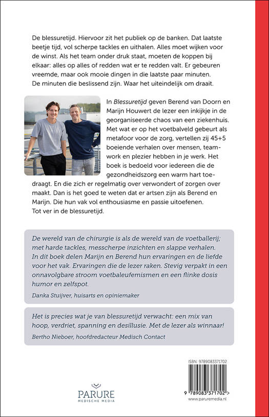 In Blessuretijd geven Berend van Doorn en Marijn Houwert de lezer een inkijkje in de georganiseerde chaos van een ziekenhuis. Met wat er op het voetbalveld gebeurt als metafoor voor de zorg, vertellen zij 45 +5 boeiende verhalen over mensen, teamwork en plezier hebben in je werk. Het boek is bedoeld voor iedereen die de gezondheidszorg een warm hart toedraagt. En die zich er regelmatig over verwondert of zorgen over maakt. Dan is het goed te weten dat er artsen zijn als Berend en Marijn. Die hun vak vol enthousiasme en passie uitoefenen. Tot diep in de blessuretijd.