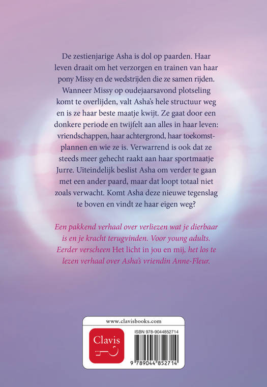De zestienjarige Asha is dol op paarden. Haar leven draait om het verzorgen en trainen van haar pony Missy en de wedstrijden die ze samen rijden. Wanneer Missy op oudejaarsavond plotseling komt te overlijden, valt Asha's hele structuur weg en is ze haar beste maatje kwijt. Ze gaat door een donkere periode en twijfelt aan alles in haar leven: vriendschappen, haar achtergrond, haar toekomstplannen en wie ze is. Verwarrend is ook dat ze steeds meer gehecht raakt aan haar sportmaatje Jurre. Uiteindelijk beslist Asha om verder te gaan met een ander paard, maar dat loopt totaal niet zoals verwacht. Komt Asha deze nieuwe tegenslag te boven en vindt ze haar eigen weg? Een pakkend verhaal over verliezen wat je dierbaar is en je kracht terugvinden. Voor young adults. Eerder verscheen Het licht in jou en mij, het los te lezen verhaal over Asha's vriendin Anne-Fleur.