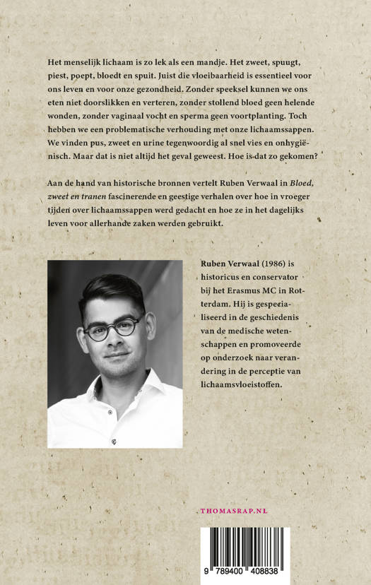 Aan de hand van historische bronnen vertelt Ruben Verwaal in Bloed, zweet en tranen fascinerende en geestige verhalen over hoe in vroeger tijden over lichaamssappen werd gedacht en hoe ze in het dagelijks leven voor allerhande zaken werden gebruikt.