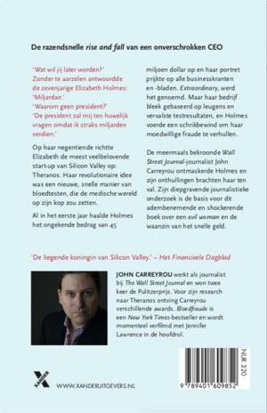 De meermaals bekroonde Wall Street Journal-journalist John Carreyrou ontmaskerde Holmes en zijn onthullingen brachten haar ten val. Zijn diepgravende journalistieke onderzoek is de basis voor dit adembenemende en shockerende boek over een evil woman en de waanzin van het snelle geld.