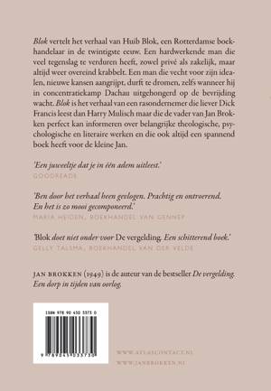 Blok vertelt het verhaal van Huib Blok, een Rotterdamse boekhandelaar in de twintigste eeuw. Een hardwerkende man die veel tegenslag te verduren heeft, zowel privé als zakelijk, maar altijd weer overeind krabbelt. Een man die vecht voor zijn idealen, nieuwe kansen aangrijpt, durft te dromen, zelfs wanneer hij in concentratiekamp Dachau uitgehongerd op de bevrijding wacht. Blok is het verhaal van een rasondernemer die liever Dick Francis leest dan Harry Mulisch maar die de vader van Jan Brokken perfect kan informeren over belangrijke theologische, psychologische en literaire werken en die ook altijd een spannend boek heeft voor de kleine Jan.