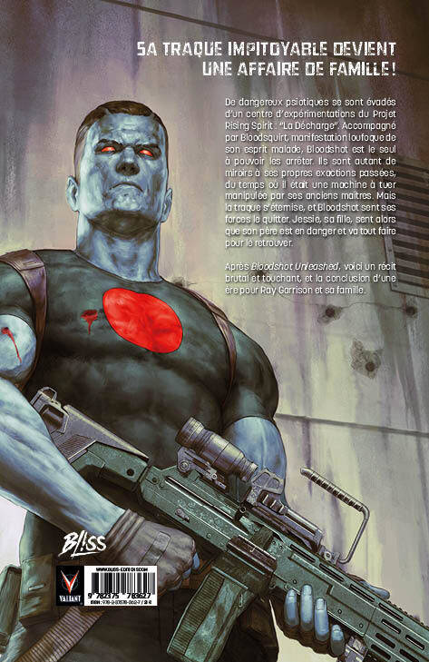 De dangereux psiotiques se sont évadés d'un centre d'expérimentations du Projet Rising Spirit : “La Décharge”. Accompagné par Bloodsquirt, manifestation loufoque de son esprit malade, Bloodshot est le seul à pouvoir les arrêter. Ils sont autant de miroirs à ses propres exactions passées, du temps où il était une machine à tuer manipulée par ses anciens maîtres. Mais la traque s'éternise, et Bloodshot sent ses forces le quitter. Jessie, sa fille, sent alors que son père est en danger et va tout faire pour le retrouver. Après Bloodshot Unleashed, voici un récit brutal et touchant, et la conclusion d'une ère pour Ray Garrison et sa famille.