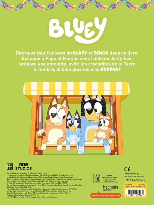 Retrouve tout l'univers de BLUEY et BINGO dans ce livre. Échappe à Papa et Maman avec l'aide de Jerry Lee, prépare une omelette, évite les crocodiles de la Terre à l'ombre, et bien plus encore. HOURRA !