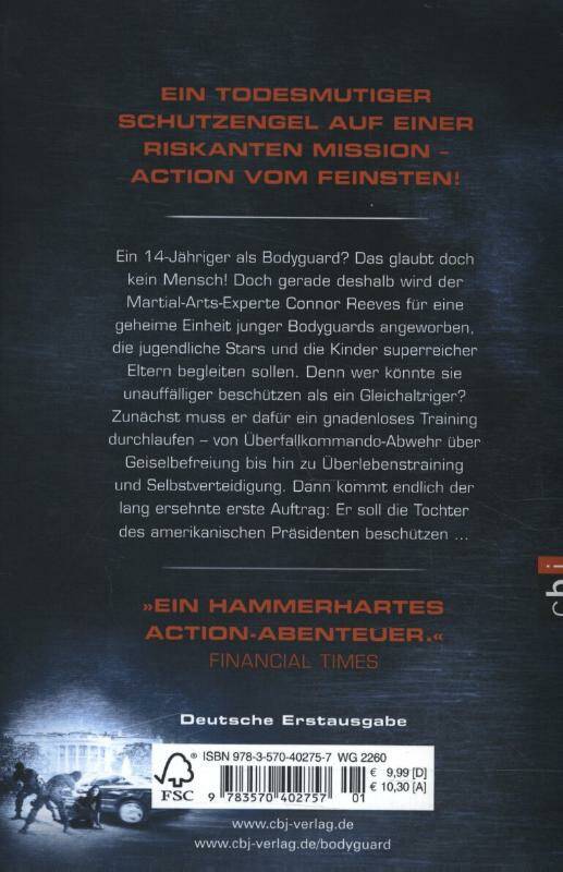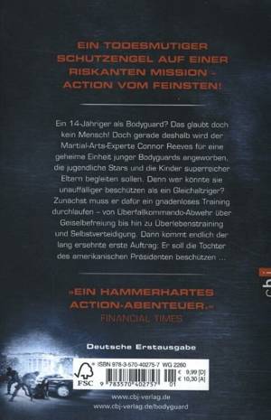 Ein knallharter Schutzengel auf einer riskanten MissionEin 14-jähriger Junge als Bodyguard? Das glaubt doch kein Mensch! Eben deshalb ist Connor Reeves bei seinen Inkognito-Einsätzen so erfolgreich. Sein erster Auftrag führt ihn direkt ins Zentrum der Macht: Er soll die Tochter des amerikanischen Präsidenten beschützen. Allerdings darf Alicia nicht merken, dass er in Wahrheit Personenschützer ist. Denn die Präsidententochter hat die Nase voll von dem goldenen Käfig, in dem sie sitzt, und entwischt den Beamten des Secret Service immer wieder. Eines Tages jedoch gerät sie ins Visier einer terroristischen Schläferzelle. Und plötzlich ist sie doch froh, dass ein Bodyguard an ihrer Seite ist: Denn Connor entpuppt sich als stahlharte Kämpfernatur.
