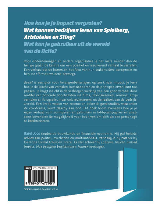 Hoe kun je je impact vergroten? Wat kunnen bedrijven leren van Spielberg, Aristoteles en Sting? Wat kun je gebruiken uit de wereld van de fictie? Voor ondernemingen en andere organisaties is het niets minder dan de heilige graal: de kennis om een positief en resonerend verhaal te vertellen. Een verhaal dat de harten en hoofden van hun stakeholders aanspreekt en hen tot affirmatieve actie beweegt. Boeie! is een gids voor belangenbehartigers op zoek naar impact. Je leert hoe je de kracht van verhalen kunt aanboren en de principes ervan kunt toepassen. Je krijgt inzicht in de verborgen werking van een goed verhaal door middel van concrete voorbeelden uit films, televisieseries, romans, stripverhalen en fotografie, maar ook rechtstreeks uit de realiteit van de bedrijfswereld. Een brede waaier van recente en bekende gevalstudies, waaronder de covidcrisis, komt daarbij aan bod. Dit boek toont eveneens hoe je je eigen verhaal kunt vormgeven en gebruiken in lobbycampagnes en analyseert bovendien de mogelijkheid voor bedrijven om zich als een personage te karakteriseren.