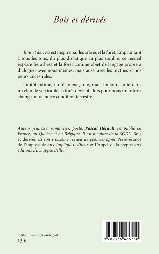 Bois et dérivés est inspiré par les arbres et la forêt. Empruntant à tous les tons, du plus drolatique au plus sombre, ce recueil explore les arbres et la forêt comme objet de langage propre à dialoguer avec nous-mêmes, mais aussi avec les mythes et nos peurs ancestrales. Tantôt intime, tantôt menaçante, mais toujours unie dans un élan de verticalité, la forêt devient alors pour nous un miroir changeant de notre condition terrestre.
