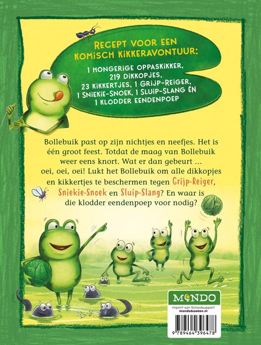 Bollebuik past op zijn nichtjes en neefjes. Het is één groot feest. Totdat de maag van Bollebuik weer eens knort. Wat er dan gebeurt … oei, oei, oei! Lukt het Bollebuik om alle dikkopjes en kikkertjes te beschermen tegen Grijp-Reiger, Sniekie-Snoek en Sluip-Slang? En waar is die klodder eendenpoep voor nodig?