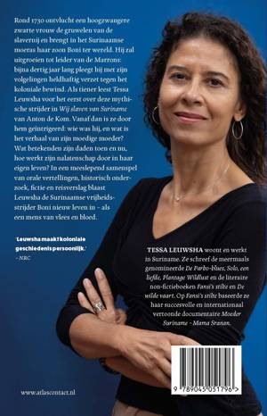 Het opperhoofd Bonni. […]. In hem verenigden zich de kracht en moed van de jaguar met de slanke vlugheid van onze herten. Anton de Kom in Wij slaven van Suriname Rond 1730 ontvlucht een hoogzwangere zwarte vrouw de gruwelen van de slavernij en brengt in het Surinaamse moeras haar zoon Boni ter wereld. Hij zal uitgroeien tot leider van de Marrons: ruim dertig jaar lang pleegt hij met zijn volgelingen heldhaftig verzet tegen het koloniale bewind. Als tiener leest Tessa Leuwsha voor het eerst over deze mythische strijder in Wij slaven van Suriname. Vanaf dan is ze door hem geïntrigeerd: wie was hij, en wat is het verhaal van zijn moedige moeder? Wat betekenden zijn daden toen en nu, hoe werkt zijn nalatenschap door in haar eigen leven? Tessa Leuwsha reist door Suriname en zoekt naar Bonis wortels in Ghana, ze spit door de schaarse archieven en put rijkelijk uit orale geschiedenis. Gebaseerd op feiten en ondersteund door haar sprankelende literaire verbeeldingskracht herschept ze de Surinaamse vrijheidsstrijder Boni als mens van vlees en bloed.