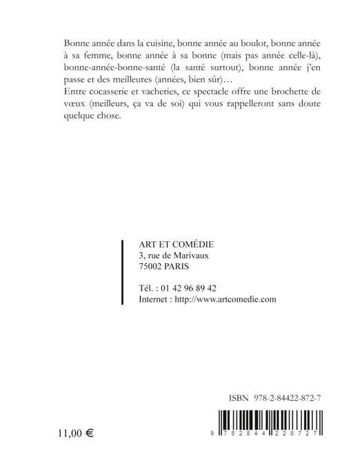 Bonne année dans la cuisine, bonne année au boulot, bonne année à sa femme, bonne année à sa bonne (mais pas année celle-là), bonne-année-bonne-santé (la santé surtout), bonne année j'en passe et des meilleures (années, bien sûr)... Entre cocasserie et vacheries, ce spectacle offre une brochette de voeux (meilleurs, ça va de soi) qui vous rappelleront sans doute quelque chose.
