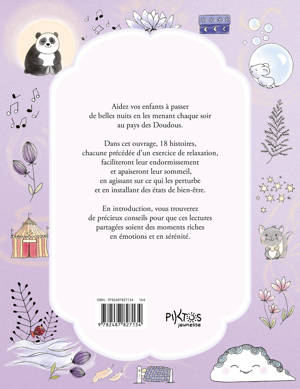 Conçue par une spécialiste du bien-être, cet ouvrage, propose 18 histoires à lire à son enfant pour l’amener à un sommeil apaisé et tranquille. Chaque histoire est précédée d’un exercice de relaxation pour une mise en condition propice à l’écoute puis l’endormissement. Au début de l’ouvrage, une mise en perspective et des conseils aux parents permettent de faire de ce livre un véritable compagnon de nuit.