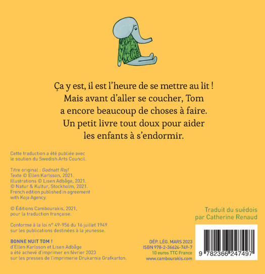 Ça y est, il est l'heure de se mettre au lit ! Mais avant d'aller se coucher, Tom a encore beaucoup de choses à faire. Un petit livre tout doux pour aider les enfants à s'endormir.