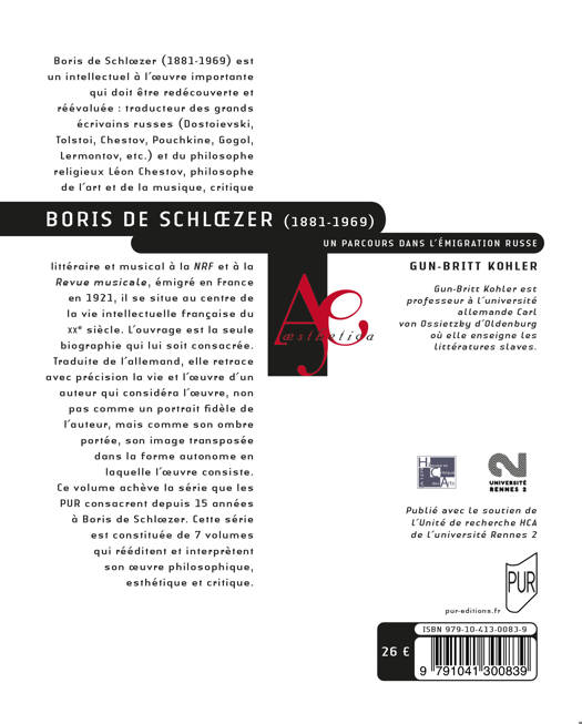 Boris de Schloezer (1881-1969) est un intellectuel à l’oeuvre importante qui doit être redécouverte et réévaluée : traducteur des grands écrivains russes (Dostoievski, Tolstoi, Chestov, Pouchkine, Gogol, Lermontov, etc.) et du philosophe religieux Léon Chestov, philosophe de l’art et de la musique, critique littéraire et musical à la NRF et à la Revue musicale, émigré en France en 1921, il se situe au centre de la vie intellectuelle française du XXe siècle. L’ouvrage est la seule biographie qui lui soit consacrée. Traduite de l’allemand, elle retrace avec précision la vie et l’oeuvre d’un auteur qui considéra l’oeuvre, non pas comme un portrait fidèle de l’auteur, mais comme son ombre portée, son image transposée dans la forme autonome en laquelle l’oeuvre consiste. Ce volume achève la série que les PUR consacrent depuis 15 années à Boris de Schloezer. Cette série est constituée de 7 volumes qui rééditent et interprètent son oeuvre philosophique, esthétique et critique.