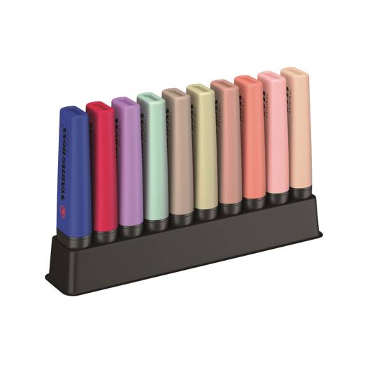 Coffret de 10 STABILO BOSS ORIGINAL NatureCOLORS. Apportez une touche esthétique à votre travail grâce à des couleurs apaisantes et inspirées de la nature. Marqueur à pointe biseautée avec des largeurs de trait de 2 et 5 mm pour surligner et souligner.
